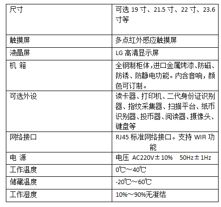 智能化綜合自助服務終端主要應用于緩解營業(yè)廳人流大的問題,提高業(yè)務辦理的速度主要用于銀行、電信、電力、醫(yī)療、航空、零售等行業(yè),可加裝各種外圍設備,如讀卡器(IC卡、ID卡、磁條卡)、條碼掃描器(一維,二維)、金屬鍵盤(加密)、微型打印機、A4打印機、二代身份證閱讀器、發(fā)卡器、指紋儀、人臉識別等等;提供個性化多種外設功能定制、外型可由用戶指定設計、設計空間自由,配置靈活,實現(xiàn)各種多功能的用途。